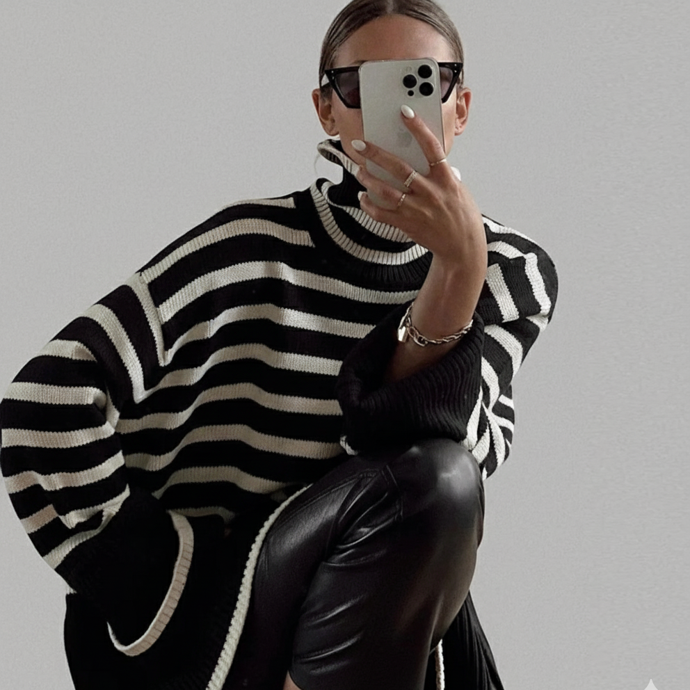 Das schwarz-weiße Streifendesign und der hohe Kragen verleihen deinem Look eine moderne, feminine Note. Der weiche, formstabile Strick legt sich angenehm um die Haut und sorgt für eine lockere Passform – perfekt für den Alltag oder kühle Frühlingstage.